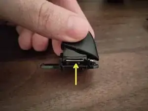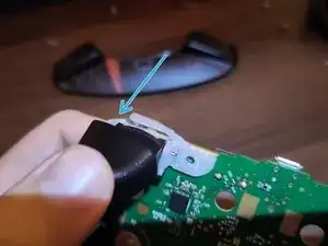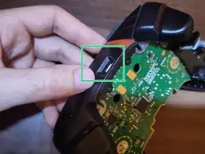 Поднимите верхнюю часть платы и установите двухчастную крышку порта USB поверх платы. Убедитесь, что она ложится поверх рычагов бамперов креплений триггеров и что разъем micro USB заподлицо.