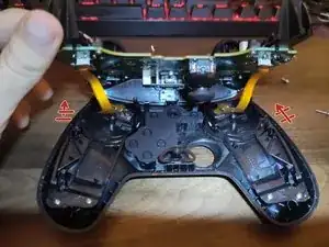 Начните класть верхнюю часть печатной платы обратно на переднюю часть контроллера и аккуратно подключите ленточные кабели тачпадов.