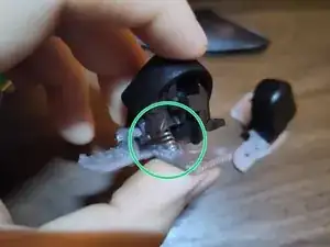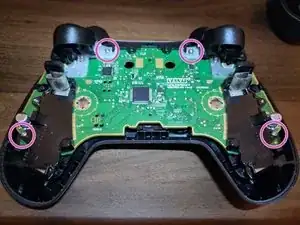 Переверните печатную плату и открутите два винта Torx T6 в верхних углах, удерживающих крепления триггеров.