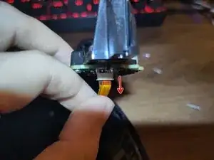БУДЬТЕ ОСТОРОЖНЫ! Под платой находятся два ленточных кабеля, подключенные к тачпадам. Поднимите плату достаточно высоко, чтобы добраться до ленточных кабелей, и аккуратно отключите их мягкими пинцетом или пальцами.
