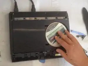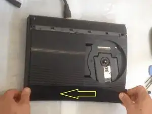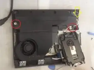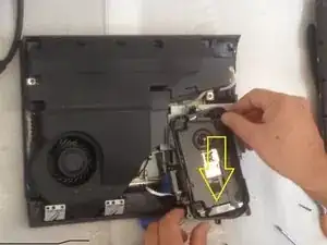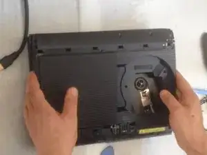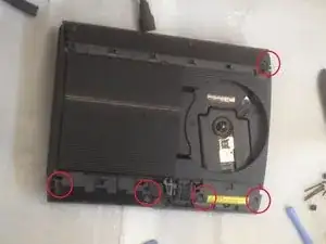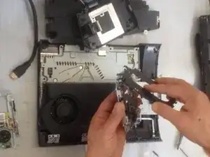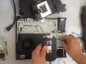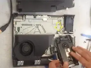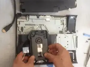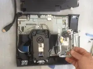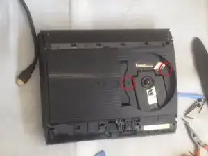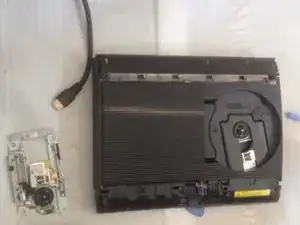 Отключите два гибких кабеля и отодвиньте лазерный блок. Снимите два винта и маленький кабель, затем извлеките блок питания.