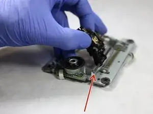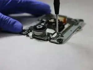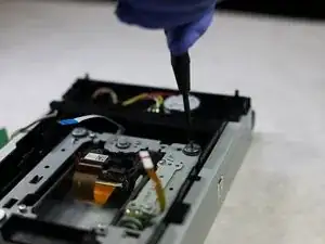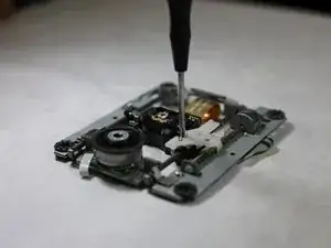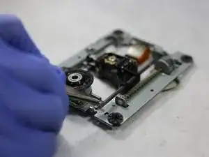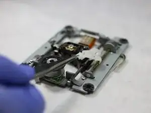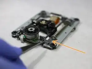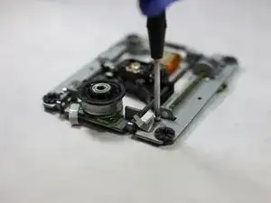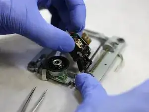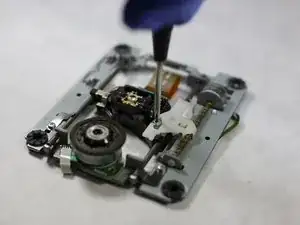 Прикрепите пластиковую фиксацию к лазерной линзе и с помощью крестовой отвёртки снова закрепите винт. Линза теперь должна быть прикреплена к направляющей.