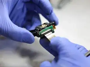 Подсоедините шлейф к запасной линзе, вставив его на место и закрыв пластиковый зажим.