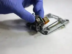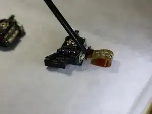 С помощью лопатки освободите пластиковый зажим, удерживающий шлейф на лазерной линзе.