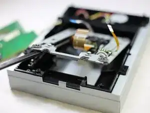 Выньте узел направляющей из дискового привода. Отложите дисковый привод в сторону.