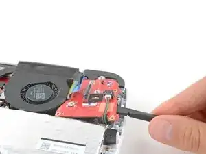 Используйте плоский конец лопатки, чтобы аккуратно сдвинуть фиксирующую планку от разъёма, чтобы отщёлкнуть её.