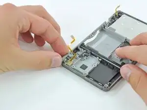Используйте пластиковый инструмент для вскрытия, чтобы отсоединить ленточные кабели кнопок-плеча от их разъёмов на материнской плате.