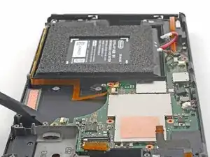 Используйте инструмент для вскрытия, лопатку или ноготь, чтобы откинуть шарнирную фиксирующую защёлку на ZIF-разъёме дисплея.