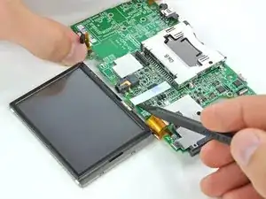 Используйте плоский конец медиатора или ноготь, чтобы приподнять фиксирующую защелку на ZIF-разъёме ленточного кабеля ЖК-дисплея.