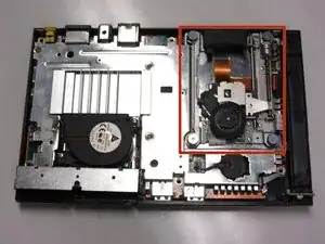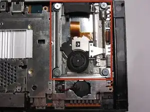 Найдите оптический привод, занимающий большую часть правой стороны устройства. Его можно идентифицировать по четырём винтам с широкими головками, которыми привод прикреплён к материнской плате.
