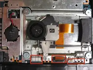 Найдите три ленточных кабеля, соединяющие оптический привод с материнской платой.