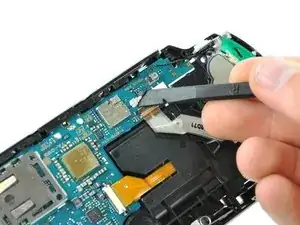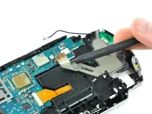 Используя плоский конец лопатки, подденьте плату кнопки питания и снимите её с PSP 300xc.