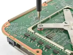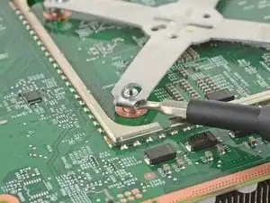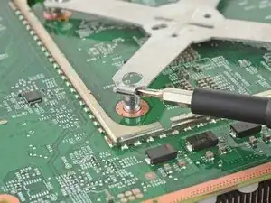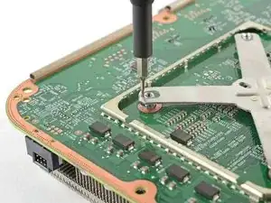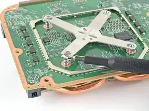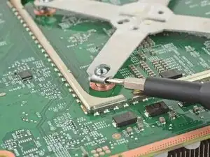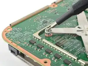 Используйте отвертку Torx T8, чтобы выкрутить четыре винта длиной 9,4 мм, крепящие материнскую плату к шасси.