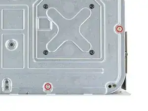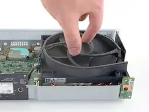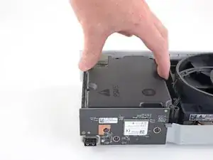 Используйте отвертку Torx T10, чтобы вывернуть два винта длиной 11,3 мм, фиксирующих вентилятор к шасси.