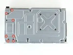 Используйте отвертку Torx T10, чтобы вывернуть семь винтов длиной 51 мм, крепящих шасси к пластиковому корпусу.