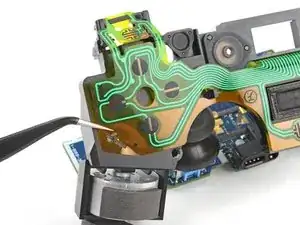 Используйте пинцет или наконечник лопатки, чтобы приподнять нижнюю сторону секции мембраны цепи кнопок R1 и R2.
