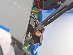Захватите за язычок кабеля верхнего микрофона пинцетом с притуплённым носиком или пальцами и отсоедините его от материнской платы.