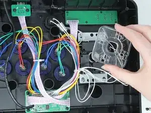 Удалите четыре винта с чашечкой на 9 мм, крепящих прозрачную пластиковую квадратную крышку джойстика к корпусу снизу, с помощью отвертки Phillips #1.