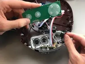 Используя отвертку J1 с крестообразным жалом, удалите шесть винтов длиной 10 мм вокруг накладки коричневой кнопки.