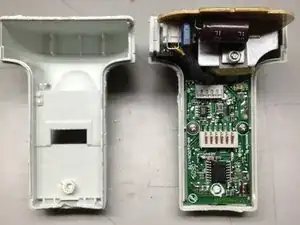 Устройство склеено, что затрудняет разборку. Используя канцелярский нож, аккуратно проведите по пластиковой поверхности сверху вниз и по всему периметру шва на лицевой, задней и нижней частях зарядного устройства. Нож начнет проникать в зарядное устройство.