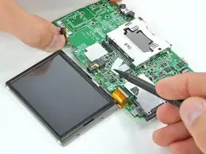 Используйте плоский конец лопатки или ноготь, чтобы приподнять защёлку крепления на ZIF-разъёме ленточного кабеля ЖК-экрана.