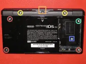 Снимите следующие семь винтов, которые закрепляют нижний корпус на DS Lite: