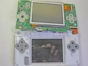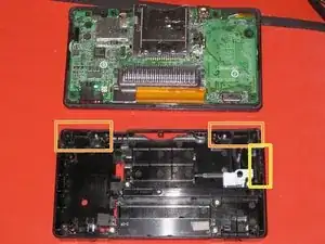 Избегайте касания кнопок L и R, так как они легко отсоединяются и их трудно установить обратно. Держите нижний корпус плоско на рабочем столе, чтобы зафиксировать кнопки плеча на месте.