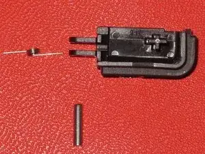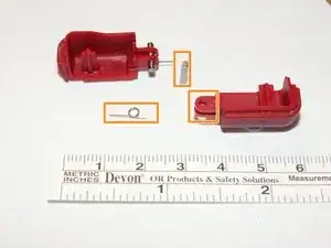 Две кнопки плеча состоят из трёх частей — пластиковой кнопки, штифта и пружины. Если они случайно выпадут во время работы, изучите изображение и убедитесь, что пружина установлена в правильное положение.
