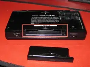 На переднем крае Nintendo DS между разъёмом для наушников и регулятором громкости извлеките пластмассовую вставку (или картридж) из нижнего слота (Слот 2).