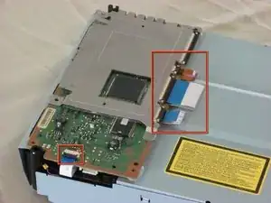 Переверните кожух оптического привода. К плате подключены четыре ленточных кабеля. С помощью лопатки или пальца поднимите каждую защёлку ленточного кабеля и отсоедините кабели.
