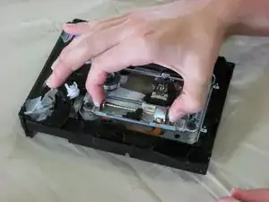 Переверните корпус. Снимите чёрную пластиковую крышку так, чтобы привод и его корпус соответствовали первой фотографии.