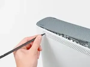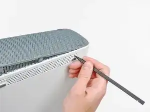 Вставьте плоский конец лопатки или край инструмента для вскрытия Xbox 360 в небольшой зазор на переднем крае нижней вентиляционной решётки.