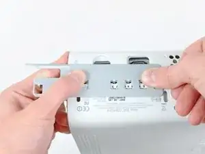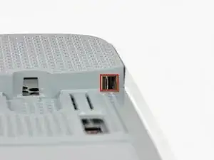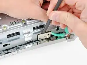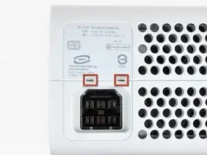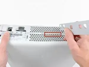 Вдавите инструмент для вскрытия Xbox 360 в два оставшихся фиксирующих зажима рядом с разъёмом питания.