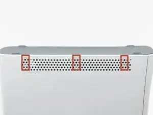 Верхняя вентиляционная решётка крепится к корпусу защёлками. Первые две защёлки расположены под верхней вентиляционной решёткой, ближе к лицевой панели, как показано на фотографиях.