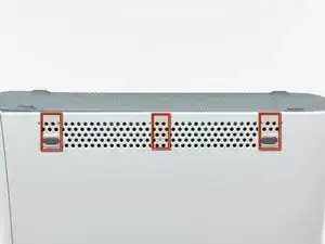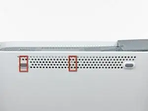 На следующих шагах вы будете использовать наконечник лопатки или выступ инструмента для вскрытия Xbox 360, чтобы освободить защёлки вдоль левой и правой сторон верхней вентиляционной решётки. Их расположение выделено красным.