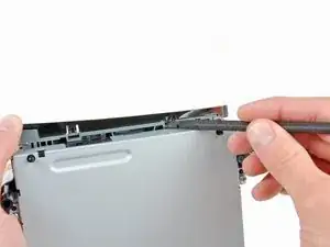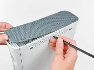 Используйте наконечник лопатки, чтобы освободить защёлку на верхней вентиляционной решётке, расположенную ближе к задней части верхней части корпуса Xbox.