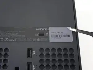 Используйте пинцет, чтобы снять наклейку, скрывающую первый винт на задней панели, рядом с основанием.