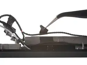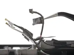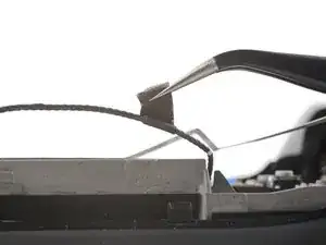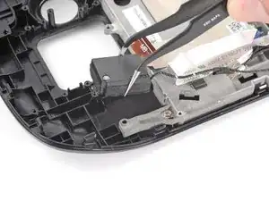 С помощью пинцета оторвите различные полоски чёрной ленты, прокладывающие провод динамика вдоль нижнего края корпуса.