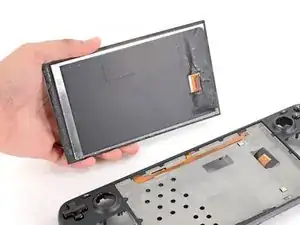 Когда вы разрежете клей по периметру дисплея, аккуратно поднимите правый край, открывая его как книгу.