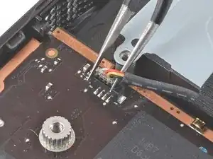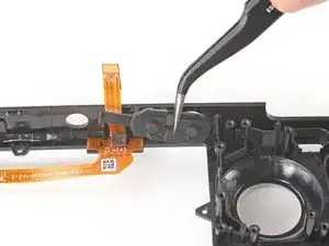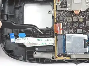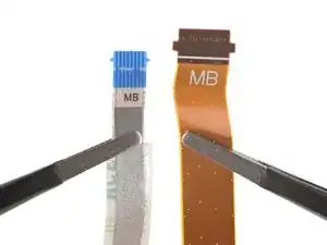 Используйте заострённый конец лопатки, чтобы приподнять маленькие фиксирующие язычки на остальных ZIF-разъёмах платы кнопок. Используйте пинцет, чтобы вытащить кабели из их разъёмов: