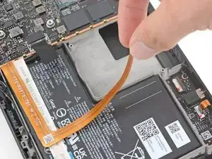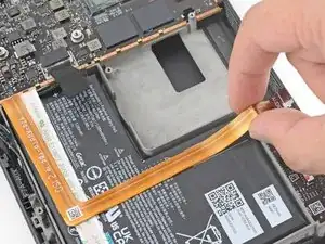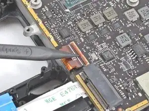 Используйте заострённый конец лопатки, чтобы поднять маленькую фиксирующую планку на ZIF‑разъёме кабеля дисплея.