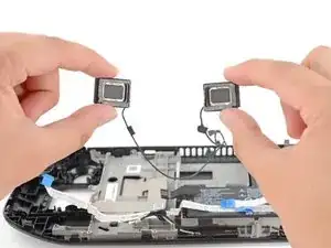 С помощью пинцета захватите и извлеките правый динамик из его выемки.