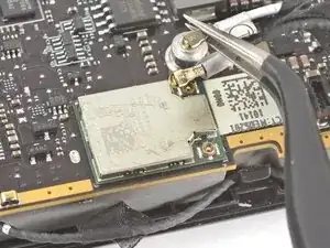 С помощью пинцета оторвите липкую ленту, связывающую провод динамика с кабелями антенны Wi‑Fi.
