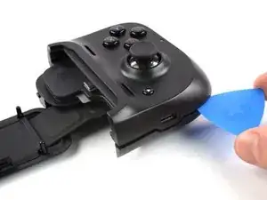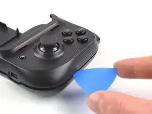 Вставьте пластиковую лопаточку в шов между верхней и нижней частями корпуса, в левый нижний угол контроллера.