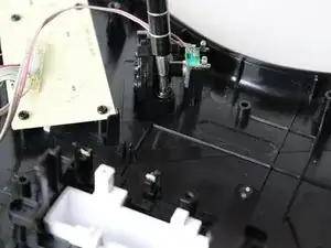 Найдите компонент переключателя внутри гитары. Компонент располагается в чёрном круглом держателе, который установлен перпендикулярно относительно внутренней части передней стороны гитары.