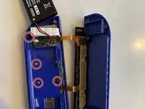 С помощью отвертки Y00 Tri-Point открутите четыре винта M1.4 x 5 мм, чтобы ослабить жёсткую пластиковую заднюю крышку Joy-Con.