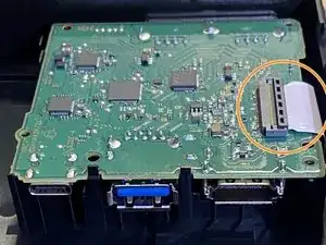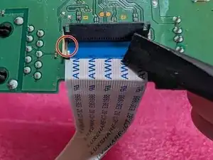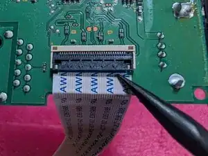 Gently pull the film cable out of the circuit board. The cable should slide free when lightly pulled. Не тяните за него сильно — вы рискуете повредить кабель или разъём.