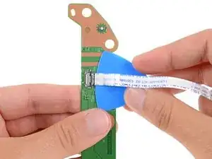 Используйте заострённый конец лопатки, чтобы нажать на металлическую защёлку сбоку разъёма платы кабеля кнопки питания.