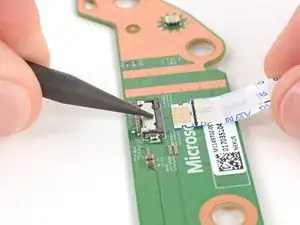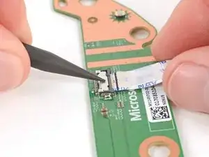 С зажатой металлической защёлкой используйте пинцет, чтобы потянуть вверх за язычок и отключить кабель кнопки питания от центрального шасси.
