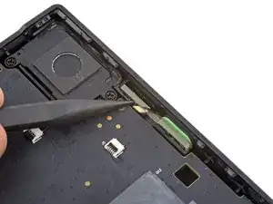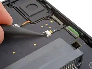 Используйте кончик лопатки или чистый ноготь, чтобы отогнуть вверх поворотную фиксирующую планку на ZIF‑разъёме кабеля питания и кнопок громкости.